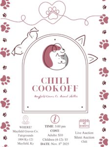 Want to be part of the fun? If you’d like to be a team and participate by bringing chili, send the Mayfield-Graves County Animal Shelter a message with your name, phone number, and address and they will send you information about everything you’ll need! You can also email them at mayfieldgravesshelter@gmail.com.