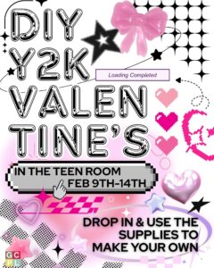 Teens are invited to drop into the teen room at the Graves County Public Library during the week of February 9th-14th to create their own Y2K themed Valentine’s Day card, they’ll have all things millennium-core 2000’s to use. While supplies last!