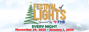 The FNB 7th Annual Festival of Lights will open to the public on Saturday, November 29th, 2025, and will run every WEEKEND NIGHT through Thursday, January 1st, 2026, from 5:30 – 8:30 PM, as well as other special weekday nights.