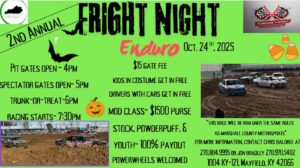 Mayfield/Graves County, it’s that time of year! Please join us for the 2nd annual “Fright Night” Enduro! Complete with a trunk or treat, costume contest, and some full contact racing! Kids in costume get in free.