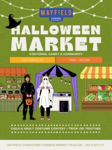 Join us for a spooktacular morning at the Mayfield Downtown Farmers Market! Dress up in your favorite costume and enjoy a festive day filled with local vendors, treats, and Halloween fun for the whole family.