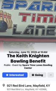 Join us at Spare Time Lanes Bowling Center for a 9 pin no tap tournament to help Keith in his journey. 100 % of tournament proceeds goes directly to him and his family. 3 games and trophies given 1st – 3rd place finishes.