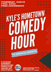 Kyle’s Hometown Comedy Hour is a clean, community-driven comedy showcase featuring a mix of local favorites and regional special guests — all bringing their best material to the heart of Mayfield.