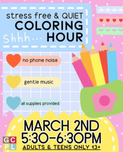Come by for a relaxing hour of coloring, all sheets and materials will be provided. Only whispering and soft music for the hour, no phone calls or phone noise of any kind. March 2nd @ 5:30pm.