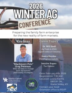 Mark your calendar for the Winter Ag Conference! Lowry Farms in Pilot Oak February 6th Topic will be preparing family farms for today’s changing market realities.Call 270-247-2334 to RSVP!